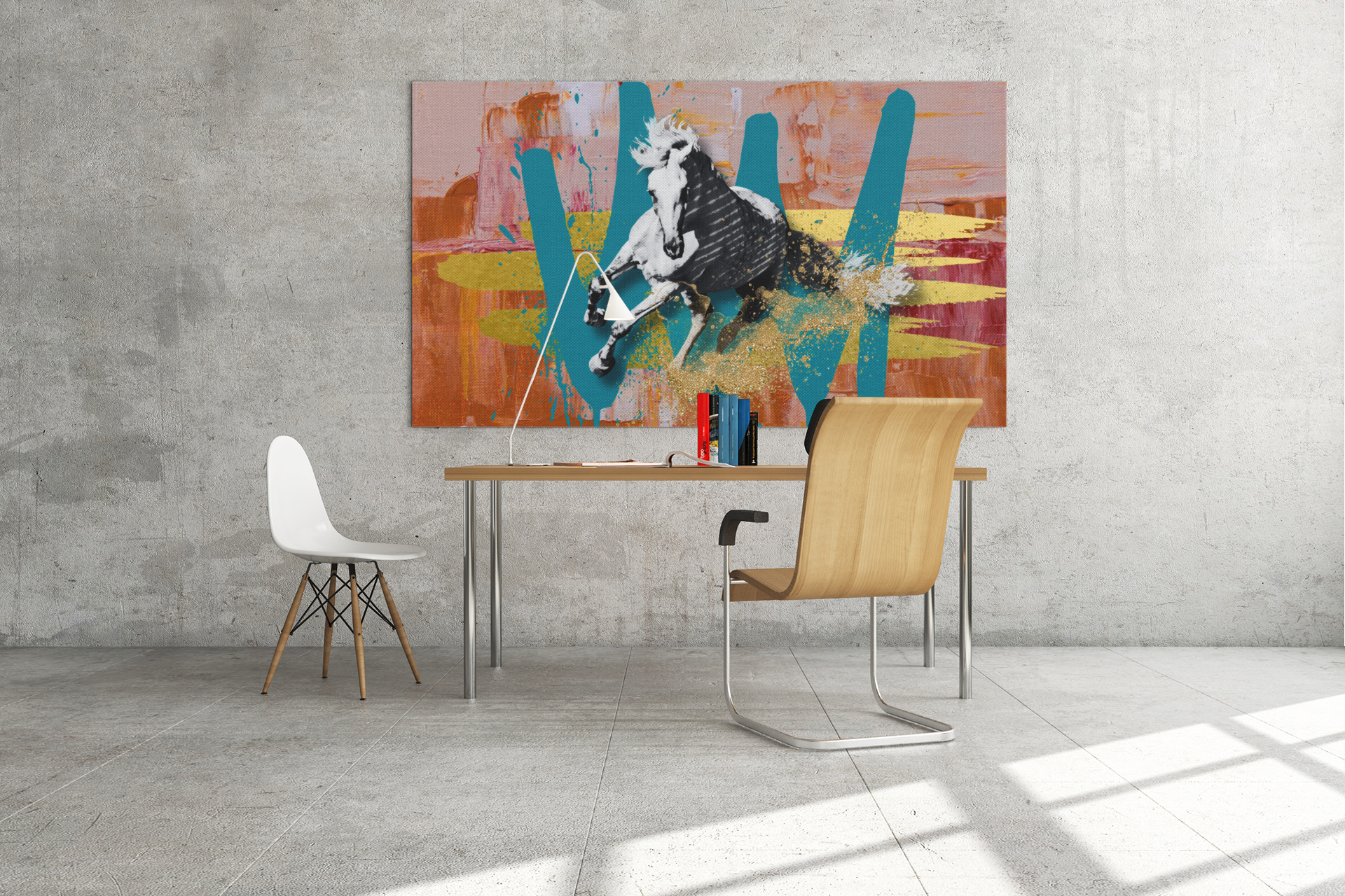 The horse’s photographic realism is contrasted with painterly textures and gestural marks, echoing modern trends found in urban art scenes and digital pop-art, yet grounding the piece in the earthy soul of Iberian tradition. The turquoise strokes, reminiscent of azulejo tiles, intersect with golden textures symbolising lineage and prestige, anchoring the visual story in Lusitano heritage.