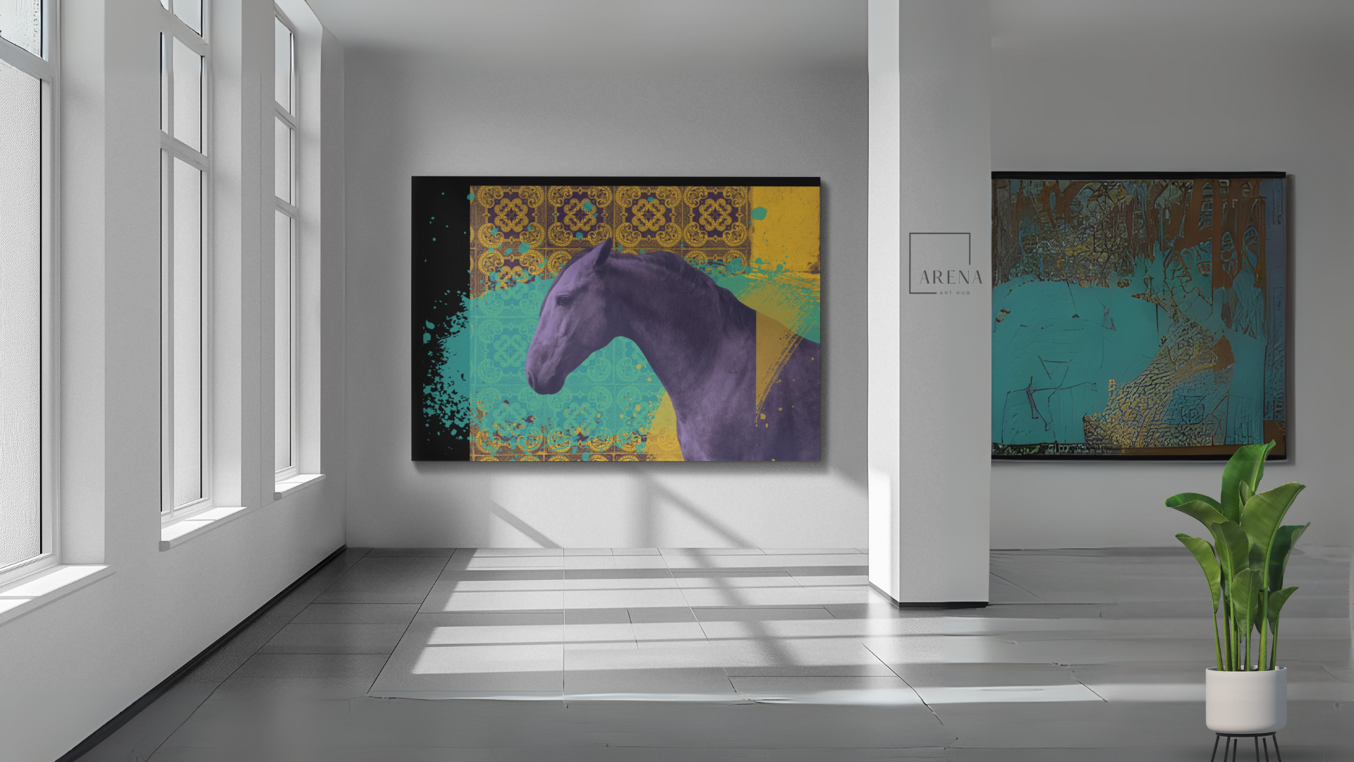 Unlike typical equestrian art, which often leans into realism or formality, this artwork celebrates the Lusitano horse through a pop-art inspired lens, making it an expressive and uplifting addition to any collection. The composition of Emerging masterfully balances structured history with fluid modernity, as the intricate azulejo backdrop grounds the piece while the bold colour treatment of the horse introduces a dynamic, almost dreamlike presence.