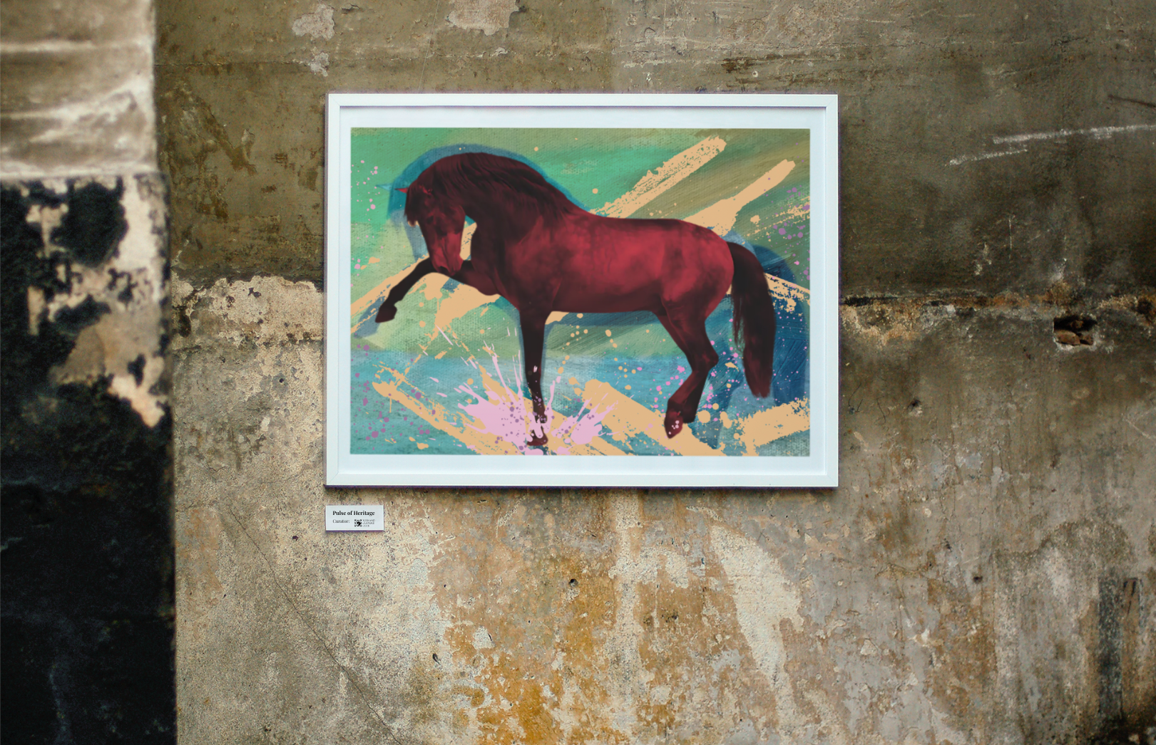 Explosive brushstrokes, vibrant pastel splashes, and dynamic colour layering contrast with the refined realism of the horse’s form, bridging heritage with a fresh, contemporary edge.